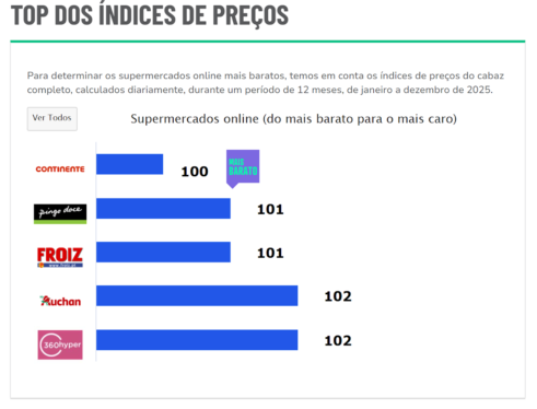 A tenda en liña de Supermercados Froiz en Portugal revalida a súa posición na clasificación e sitúase no top dos supermercados máis baratos de Portugal. Segundo o último estudo da unión de consumidores Deco Proteste, Froiz ocupa o 2º lugar na clasificación nacional dos supermercados máis baratos en 2025. O estudio que se realizou entre o 1 de xaneiro e o 31 de decembro do ano pasado, destaca á nosa empresa pola súa competitividade en prezos, compartindo clasificación con grandes retailers nacionais de Portugal.